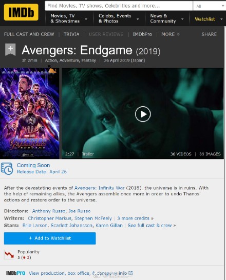 复联4片长182分钟! 根据AMC官方以及IMDb显示确认,《复仇者联盟4:终局之战》时长真的是3小时2分钟(182分钟)!创下MCU电影时长纪录!!
