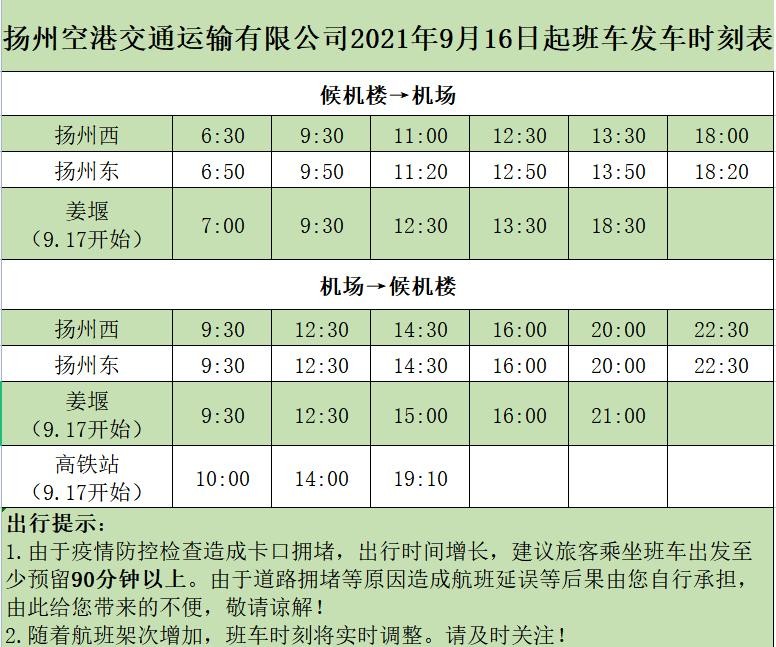 9月16日零时起,扬州泰州国际机场恢复客运航班运行。为方便旅客出行,扬州空港交通运输有限公司班车发车时刻表已新鲜出炉。据悉,由于疫情防控检查造成卡口拥堵,出行时间增长,建议旅客乘坐班车出发至少预留90分钟以上。此外,随着航班架次增加,班车时刻将实时调整,请及时关注。