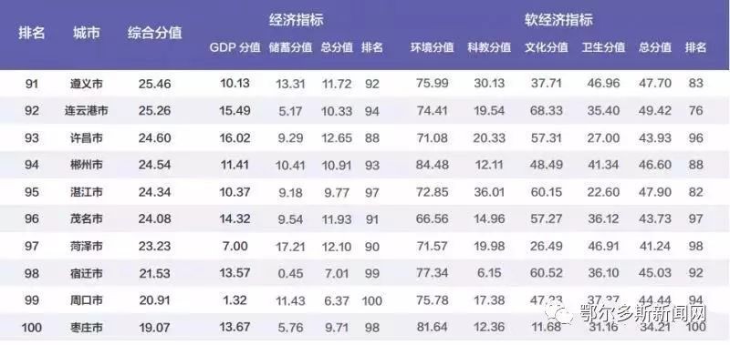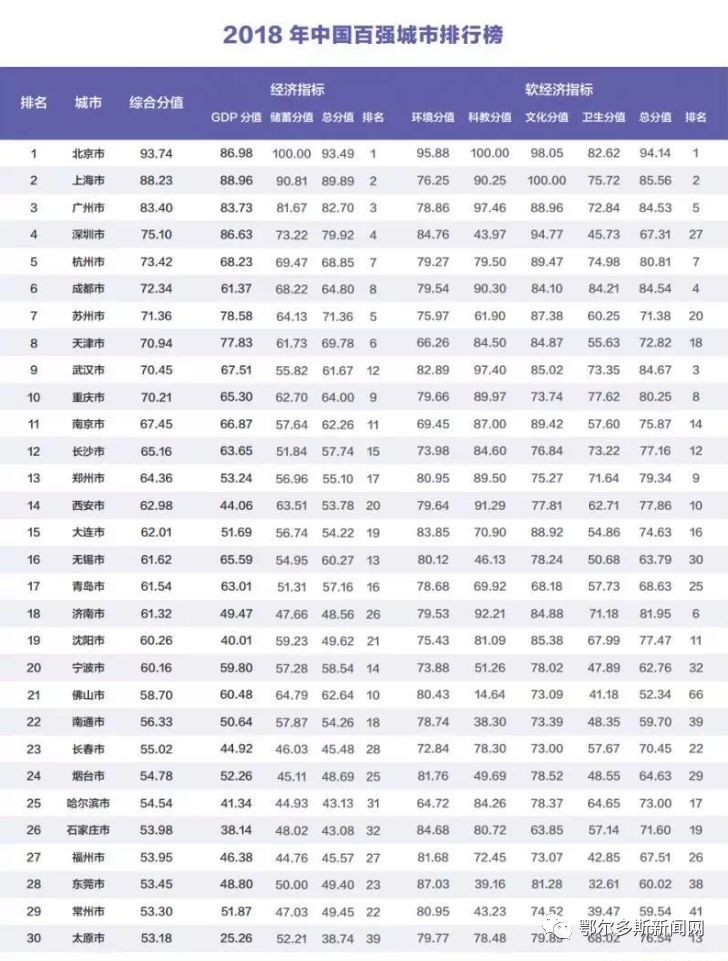 这是华顿经济研究院连续第4年编制发布“中国百强城市排行榜”数据。中国百强城市排行榜由经济和非经济(软经济)两大系列指标综合而成,数据来源于国家统计局。其中,经济指标由GDP(国内生产总值)和居民储蓄两部分构成,占比61.8%,非经济(软经济)指标由科教、文化、卫生、生态环境四部分构成,占比38.2%。