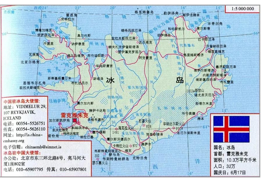 冰岛 冰岛共和国(The Republic of Iceland,Islenska Lydveldid),意为“冰的陆地”,成立于1944年6月17日。国土面积为10.3万平方千米,人口约为32万,是欧洲人口密度最小的国家。因其为岛国,汉译成冰岛,是欧洲国名中唯一采用意译的汉语名称。冰岛虽意为“冰冻的陆地”,而实际上这块游离于北欧大陆之外的岛国,却是绿草茵茵,地热丰富,渔业发达的富饶国家。20世纪前,冰岛人主要依靠渔业和农业为生,冰岛亦曾是该地区最不发达的国家。捕鱼业的工业化以及二战后美国马歇尔计划的援助带来了冰岛的繁荣。20世纪前,冰岛人主要依靠渔业和农业为生,冰岛亦曾是该地区最不发达的国家。捕鱼业的工业化以及二战后美国马歇尔计划的援助带来了冰岛的繁荣。1994年冰岛加入了欧洲经济区