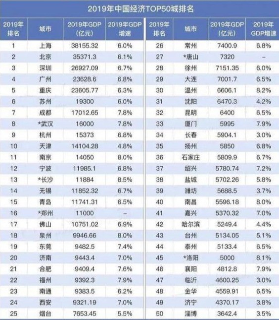 2019年中国大中型城市50强GDP排行,江苏盐城表现优异