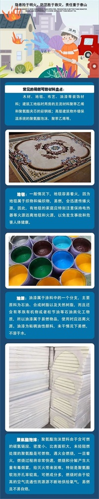 在我们平时的生产、生活中,安全隐患由不得半点马虎!易燃可燃物存在于生活中的各个角落,例如:木材、地毯、布艺、油漆等。大多数都具有容易燃烧、传播迅速等特性。如果疏忽大意,极易造成火灾。