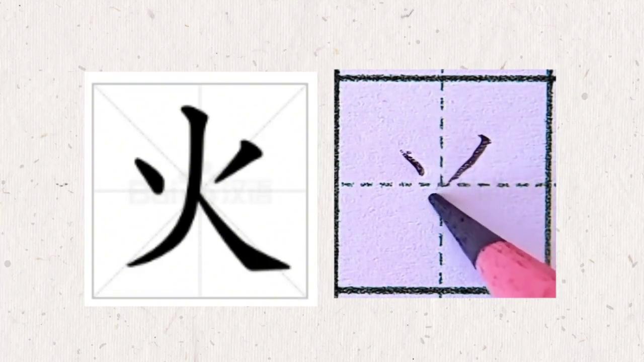 火字的第一笔是一个点,点的位置在横中线靠上一点,由轻到重,停住。点对应的是一个短撇,起笔比点的位置稍高。