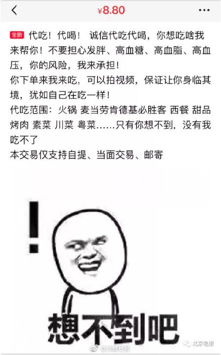 您怎么看【代喝奶茶代吃炸鸡 另类“体验消费”层出不穷】“代吃!代喝!你想吃啥我帮你!不要担心发胖、高血糖、高血脂、高血压,你的风险,我来承担!”近日,网上“代吃喝”服务火了。买家只要在原有食品价格基础上增加一定服务费用,就能让人替自己品尝相应食物,通常是火锅、炸鸡、快餐、奶茶、烤肉等热量爆表的食物。如今年轻一代的消费逐渐从实物商品中延伸至其他范畴,年轻人对于“消费”含义正进行着另一种解构与解读,花钱不一定非要买商品实物,可以是一种体验,可以是一种演练,也可以是一种纯粹的解压方式。via北京晚报