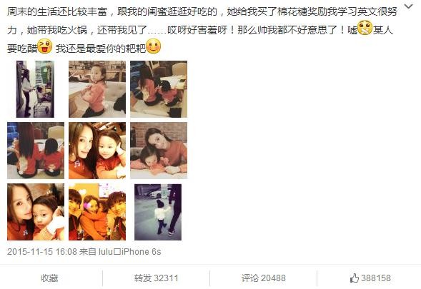 在11月15日,李小璐晒出一组与甜馨的生活照,并模仿甜馨的语气发文讲述周末生活。不仅惬意地“逛吃”,还约见了帅气的TFBOYS成员王俊凯王源。