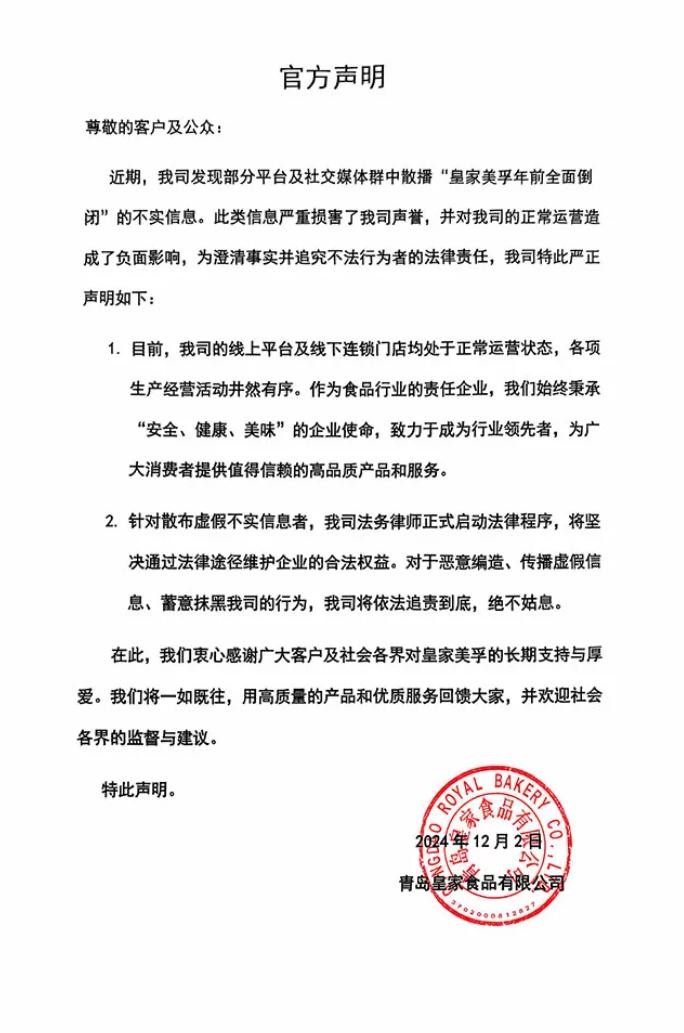官方声明中表示,目前,皇家美孚公司的线上平台及线下连锁门店均处于正常运营状态,各项生产经营活动并然有序。作为食品行业的责任企业,始终秉承“安全、健康、美味”的企业使命,致力于成为行业领先者,为广大消费者提供值得信赖的高品质产品和服务。针对散布虚假不实信息者,公司法务律师正式启动法律程序,将坚决通过法律途径维护企业的合法权益。对于恶意编造、传播虚假信息、蓄意抹黑的行为,将依法追责到底,绝不姑息。