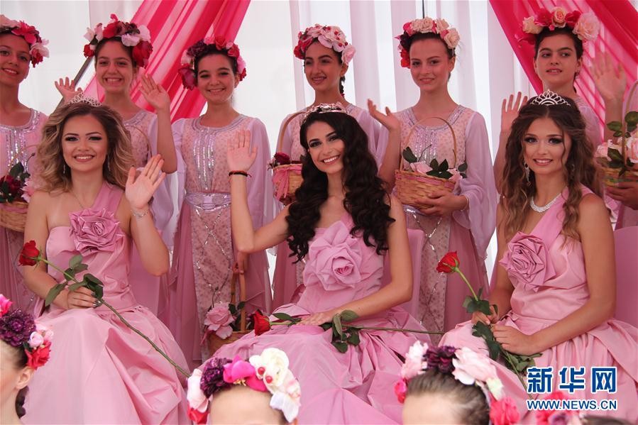 ↑6月2日,在保加利亚卡赞勒克,新当选的“玫瑰皇后”(前排中)与当地花农共庆玫瑰节。 保加利亚久负盛名的玫瑰节2日在“玫瑰之都”卡赞勒克进入高潮。卡赞勒克距保加利亚首都索非亚约200公里,地处巴尔干山脉南麓的一狭长谷地的中心,谷地因种植玫瑰而闻名于世。 新华社记者 战小漪 摄