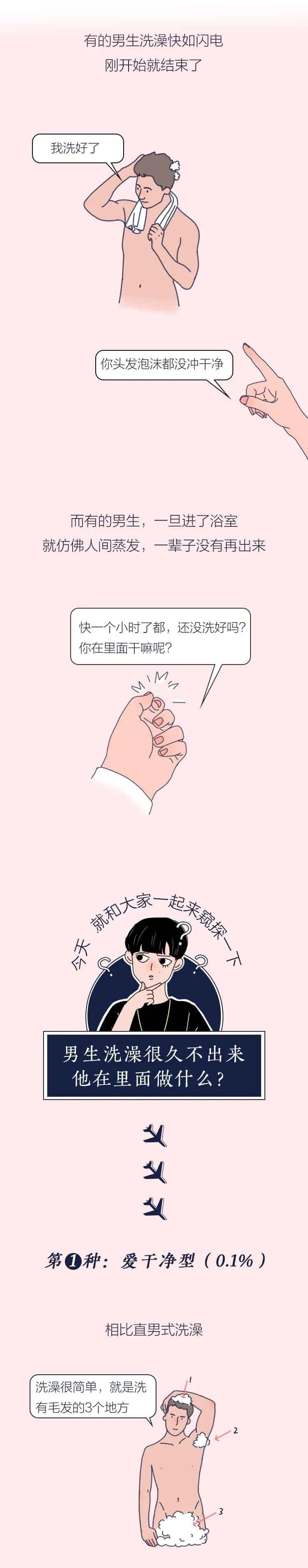 在很多人看来,男生洗澡不仅速度快,步骤也比较简单,洗个头,冲个澡就出来了,算算时间的话,差不多十来分钟就可以。但你们不知道的是,有些男生洗澡能洗一个多小时,可以说是比女生还要慢。