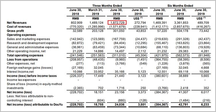 ■图片/斗鱼2019 Q2财报截图