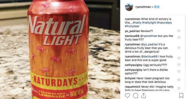 百威啤酒旗下的品牌 natural light 推出的淡啤酒销量一直挺不错的。2月底,natural light 新出了一款专为“春假”(美国的 spring break)设计的草莓柠檬味啤酒。
