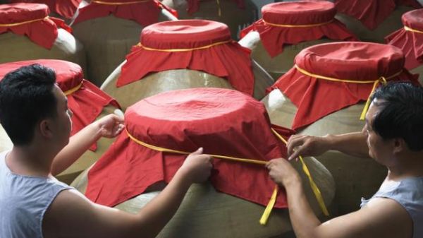 这一工序结束后,会被送到一个个巨大的陶坛里进行存储。