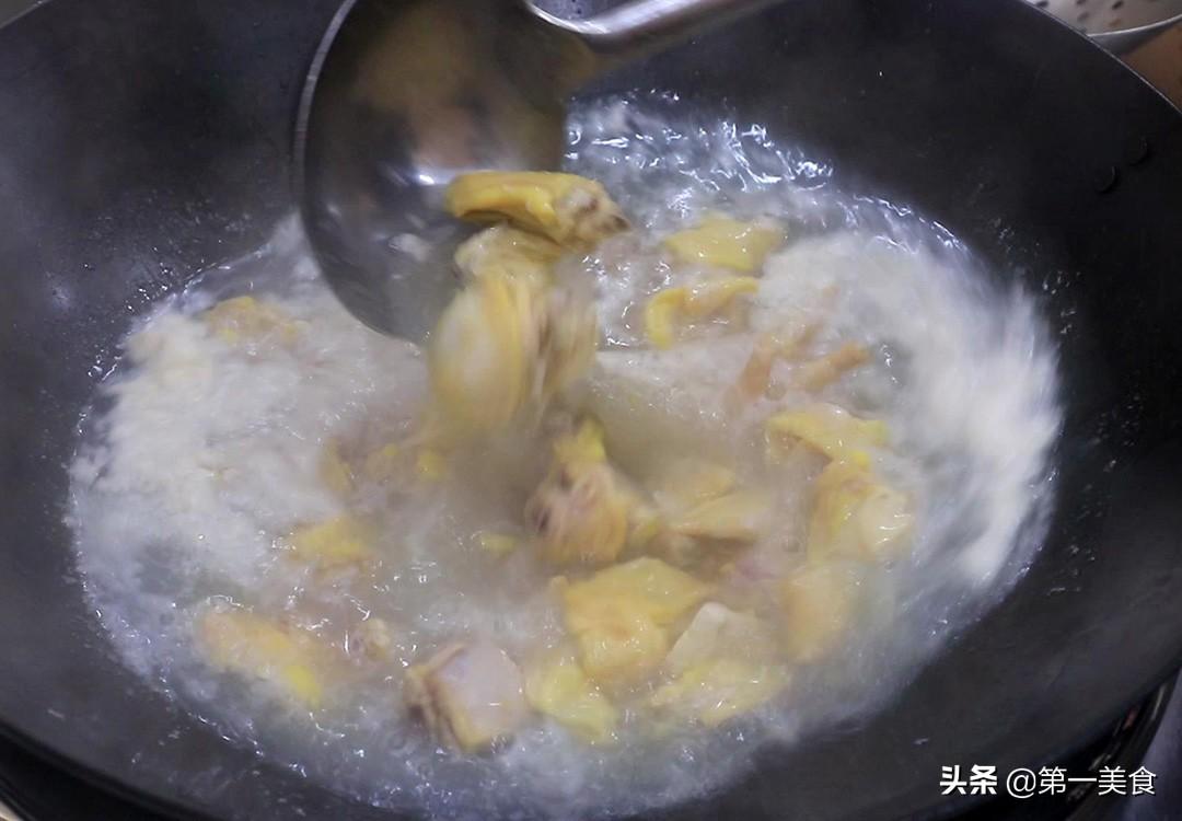 锅内烧水,冷水放入鸡块,加入几片生姜去腥,鸡块冷水下锅更容易煮出里面的血水和杂质,开小会慢慢煮,水烧开以后把煮出的杂质用勺子打干净,大约煮3分钟,鸡块变色立即倒出来,用清水把上面的血沫洗干净,沥干水分备用。