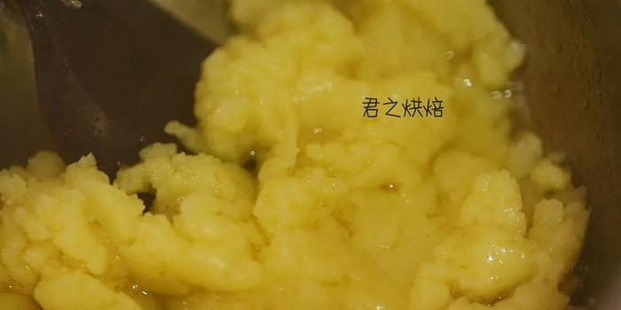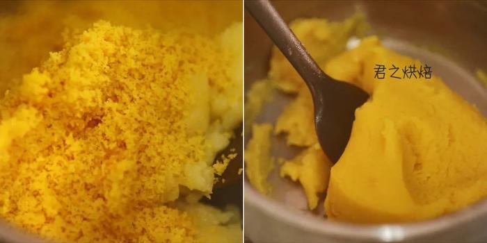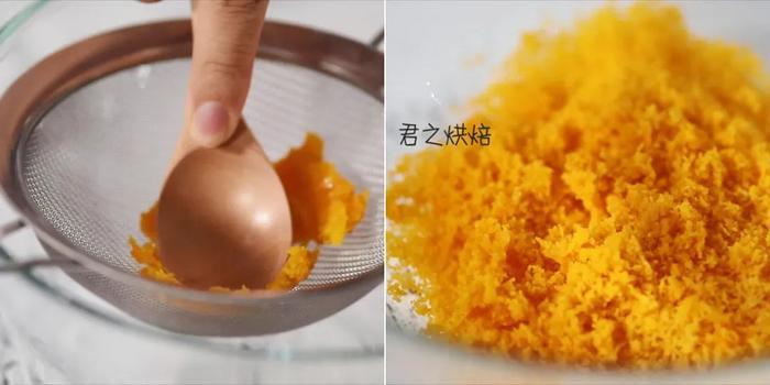 冷却以后,将咸蛋黄用筛网过筛,成为细腻的咸蛋黄蓉,将咸蛋黄蓉放在一边备用。这一步稍微有点费力气哈,耐心慢慢来!