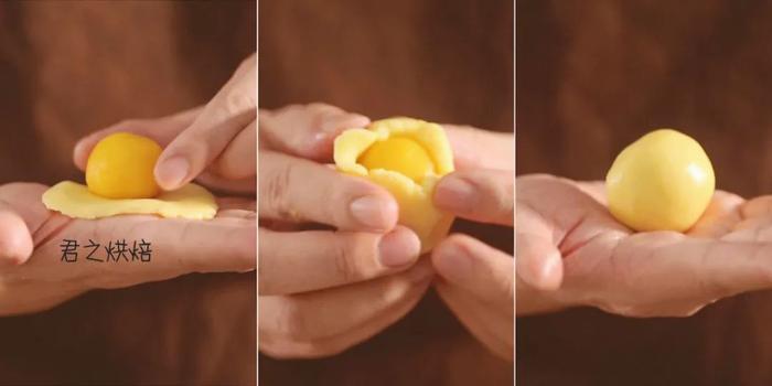 将月饼皮面团在手心压扁,然后放上一个奶黄馅,将奶黄馅包起来。