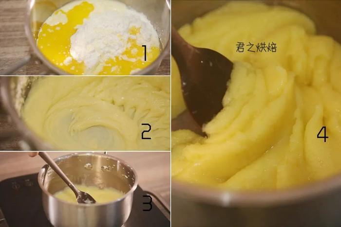 将奶锅用中火加热。一边加热一边用硅胶刮刀不断快速搅拌,直到混合物煮沸,成为稠厚的质地。离火。