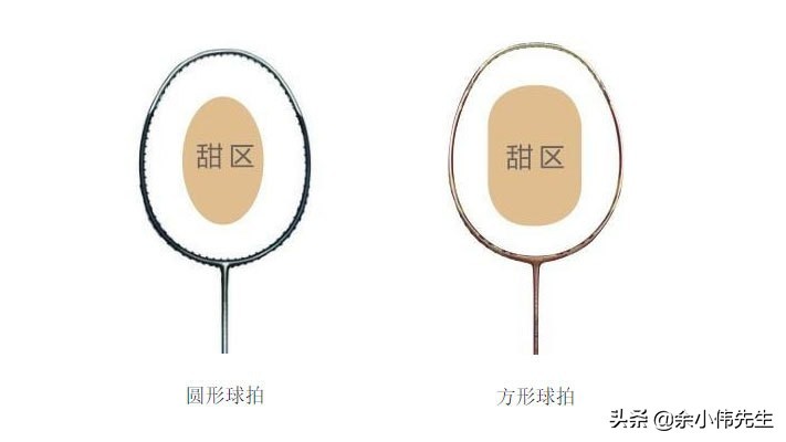 从拍头形状区分有方形拍头和圆形拍头,对应的甜区也不相同。甜区是球拍的有效击球区,一般位于球拍中心稍靠上的位置。甜区击球威力大,震动感小,控球性好。方形拍头甜区大,容错率大,对新手更友好。圆形拍头相比方形拍头更小,一般为小拍面,甜区小,对击球技术有一定要求,新手容易打到拍框。
