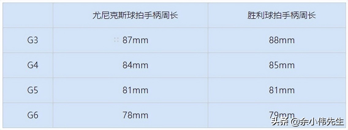 手柄的精细一般用G来表示,分为G0~G5,数字越大,拍柄就越细,越适合手小的球友。