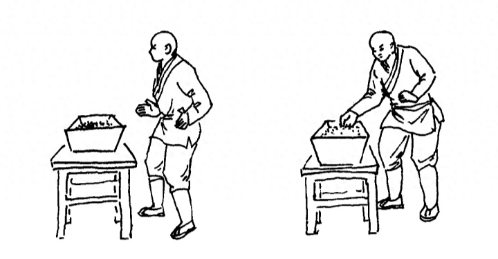 4.寸劲的具体练法:取一沙槽,内装谷物、豆类、细沙等放置桌凳上。然后左脚开立略宽于肩,拔顶提肛,两腿微屈,随吸气动作配合右掌上提,掌心向左,紧贴右肋,调息蓄气(图)待吸气蓄劲完毕后,突然两脚掌蹬地,同时配合丹田内气爆发和肌肉爆发,并开音助力,扬眉怒目,以右手掌指猛力向槽内插击(图)要求:动作协调一致,以腰带全身各部,一抖即发。如此反复左右交换训练。