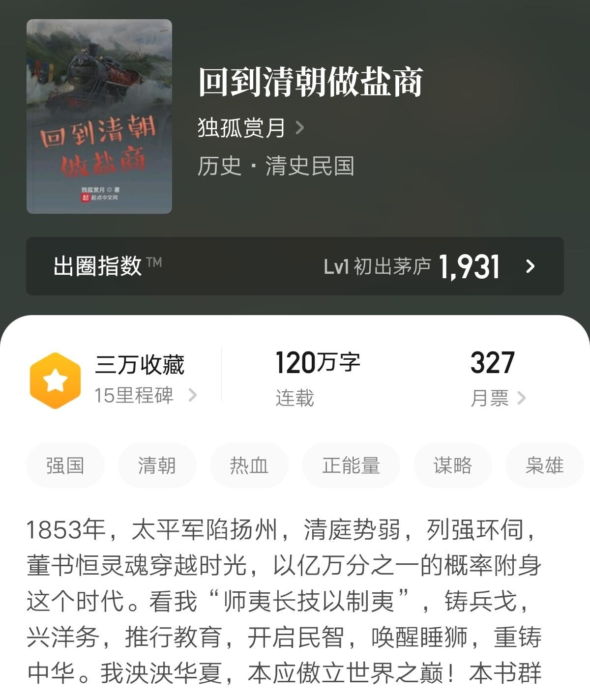 1、主角穿越到清朝时期,身份是个盐商,从自己家开始改变,努力赚钱,积攒实力,之后发展科技,推行洋务运动,改革教育,改变这个时代。