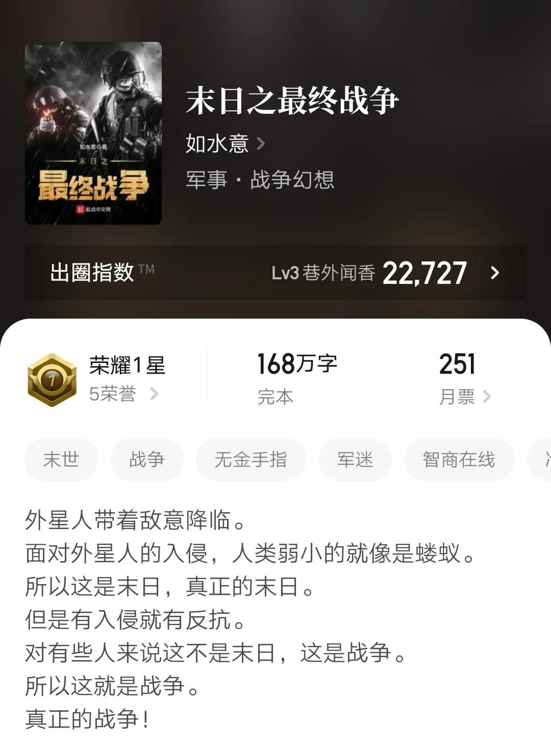 前期有大大小小的问题,金手指的存在在一定程度上降低了书的硬核程度和保持逻辑合理的难度,拓宽了本书的受众,喜欢末日,灾后生存的书友可以试试这本书,质量相当不错。