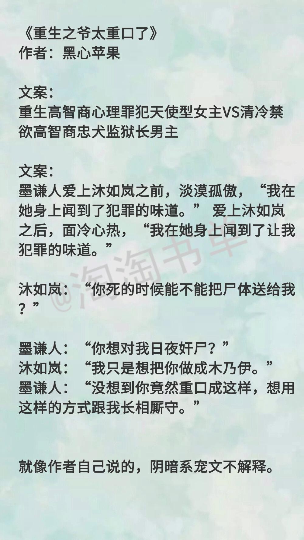书友反馈:《重生之爷太重口了》我看过的最好看的现代病娇文,整本书对病娇这两个字的把控还是很苏的,是女生会喜欢的病娇宠文,里面比较黑暗的场景适应了以后,你就会觉得挺带感的,男主的性格是我最喜欢的,默默包容,女主面前忠犬,外人面前毒舌冷漠,总结来说就是一个词就是喜欢。