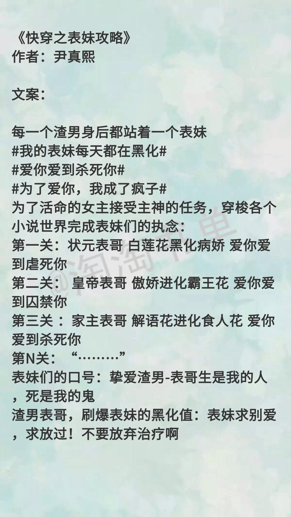 淘子有话:小说讲的是女主为了活命接受主神的任务,穿梭各个小说世界完成表妹们的执念,攻略各类渣男表哥的故事。女主要不停的穿到各种表妹的身上,黑化然后虐渣。每一篇也可以看做是独立的小故事,大多是古代。女主的篇幅大,男主后来出现~