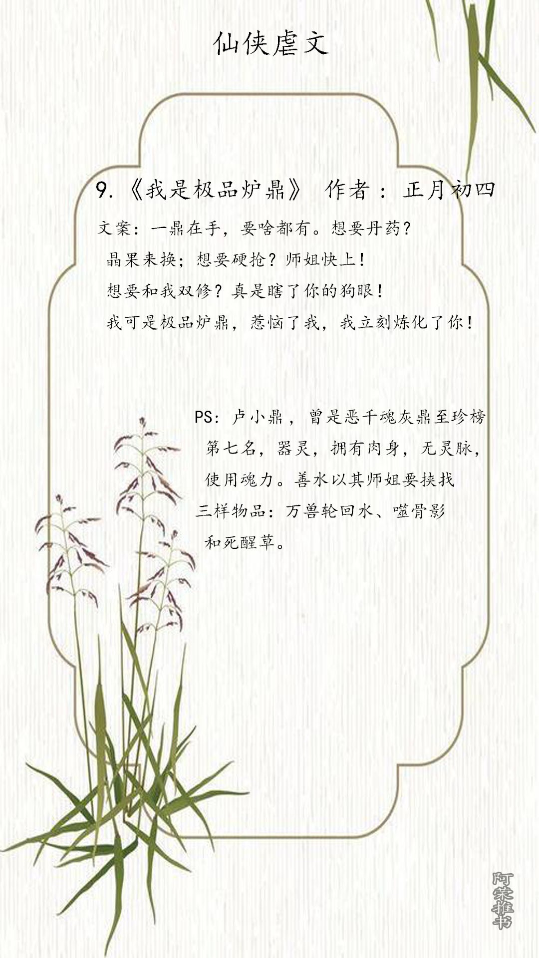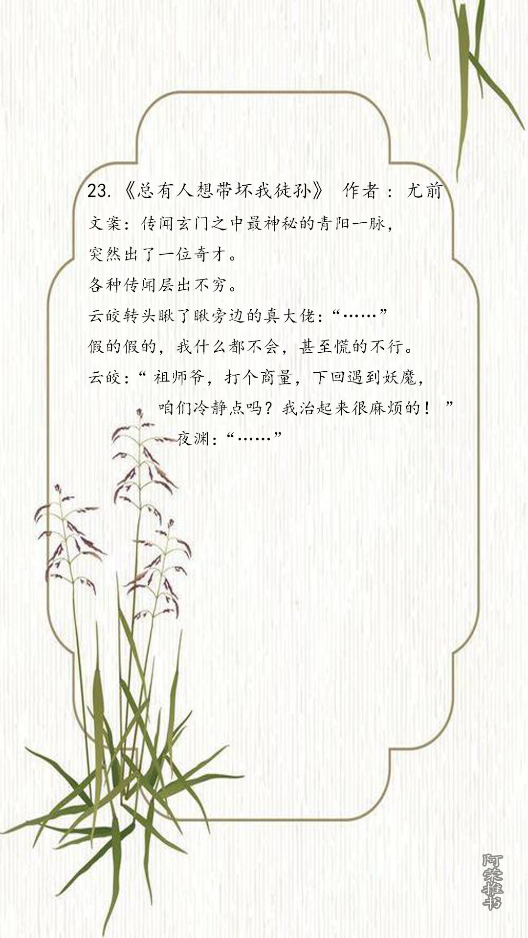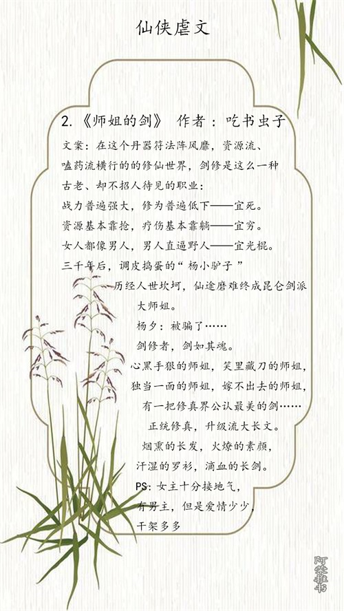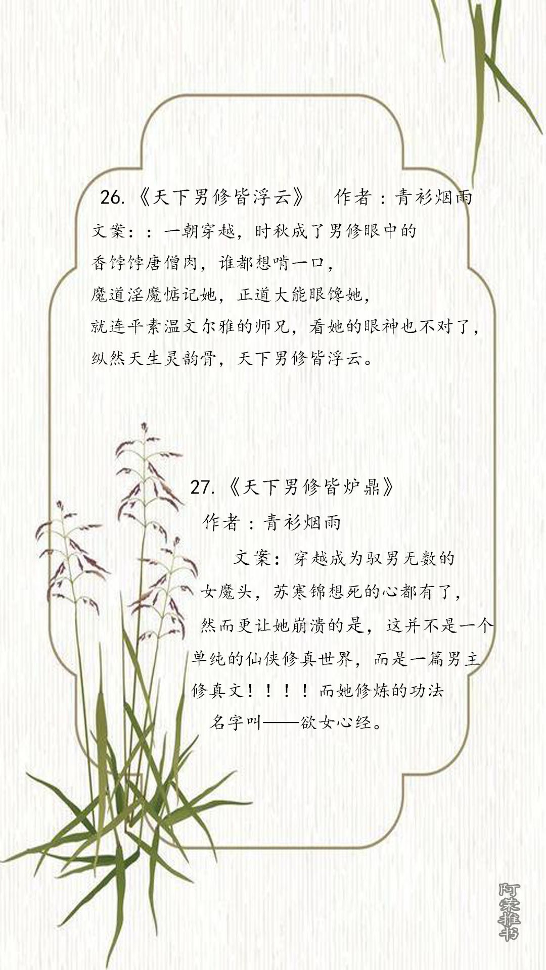 《我不成仙》 作者:时镜《师姐的剑》 作者:吃书虫子《慢慢仙途》 作者:绝世小白《驭灵女盗》 作者: 翦羽《一仙难求》 作者: 云芨《仙灵图谱》 作者: 云芨《天命为凰》 作者: 云芨《仙本纯良》 作者:正月初四《我是极品鼎炉》 作者:正月初四《凡女仙葫》 作者:冬天的柳叶《重生女修仙传》 作者: 眷念《素女寻仙》 作者: 刺嫩芽《青云之上》 作者:莲花郎面《门派只有我一个渣渣》 作者: 水木清华《误佛》 作者: 扶华《丹宫之主》 作者:秦日蓝《太素》 作者:看泉听风《史上第一佛修》 作者: 青丘千夜《一指成仙》 作者: 潭子《女修重生指南》 作者: 清骨《自欢》 作者: 袖侧《我家徒弟又挂了》 作者: 尤前《总有人想带坏我徒孙》 作者: 尤前《琴音仙路》 作者: 写文娱乐自己《仙声夺人》 作者: 午夜牧羊女《天下男修皆浮云》 作者: 青衫烟雨《天下男修皆炉鼎》 作者: 青衫烟雨《明夷于飞》 作者: 李写意《半劫小仙》 作者: o滴神《魏紫修仙传》 作者: 我为你回眸《仙瑜无瑕》 作者: 我为你回眸《男人如炉鼎》 作者: 姬昭璋《帝神通鉴》 作者: 孤在上《惟吾逍遥》 作者: 微斯人也《天道制霸计划》 作者: 幻镜真人《采石记》 作者: 顾仁棉《绝品灵仙》 作者: 顾仁棉《一剑诛仙》 作者: 猫蔻《修仙与男主为敌》 作者: 猫蔻《前任遍仙界》 作者: 青青绿萝裙《保卫国师大人》 作者: 风行水云间《宁小闲御神录》 作者: 风行水云间《大魔王娇养指南》 作者: 风行水云间《魔修求生指南》 作者: 桑莘《功德印》 作者: 青衫烟雨《勿扰飞升》 作者: 月下蝶影《夫君是未来大魔王怎么办》 作者: 雾矢翊《与天同兽》 作者: 雾矢翊《散修难为》 作者: 浮生若朝露《青云上仙》 作者: 方洄