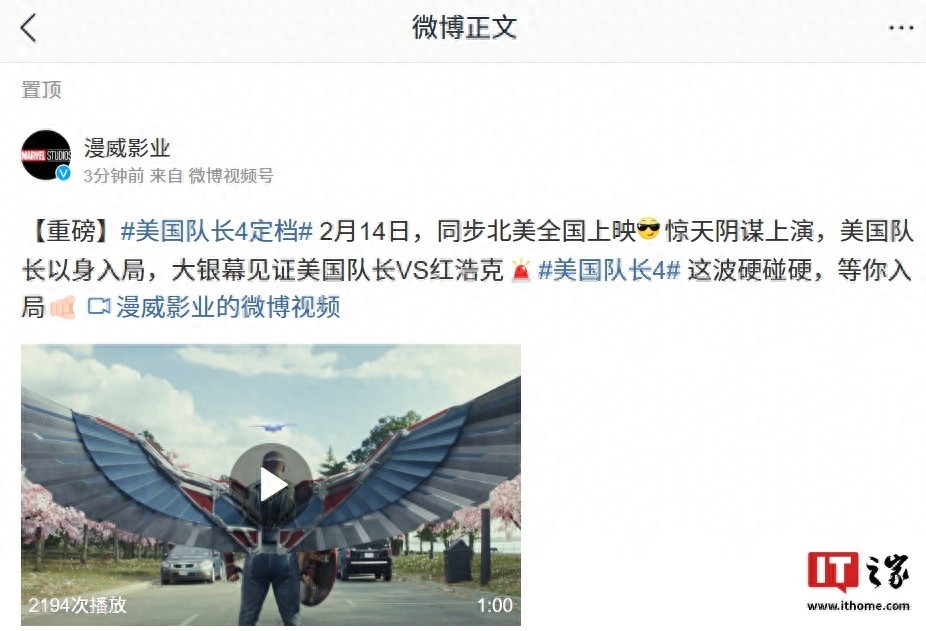 IT之家 1 月 6 日消息,漫威影业官方今日发文宣布,《美国队长 4》电影内地定档 2025 年 2 月 14 日同步北美全国上映。