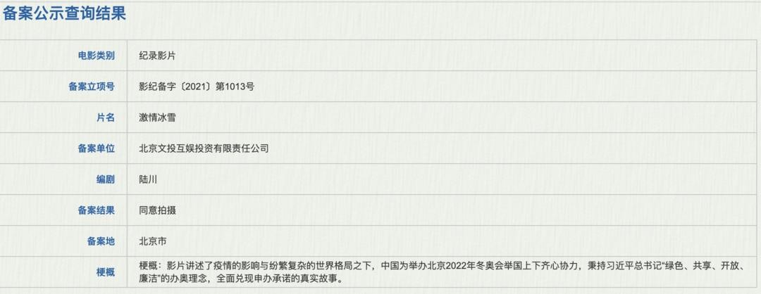 近期,国家电影局网站显示,从2021年10月至今,共有1055部新片备案立项获准拍摄,陆川编剧的纪录电影《激情冰雪》也在其中,计划年内与观众见面。而北京冬奥会在开幕前曾公布北京冬奥会官方电影主创团队,陆川正是总导演。
