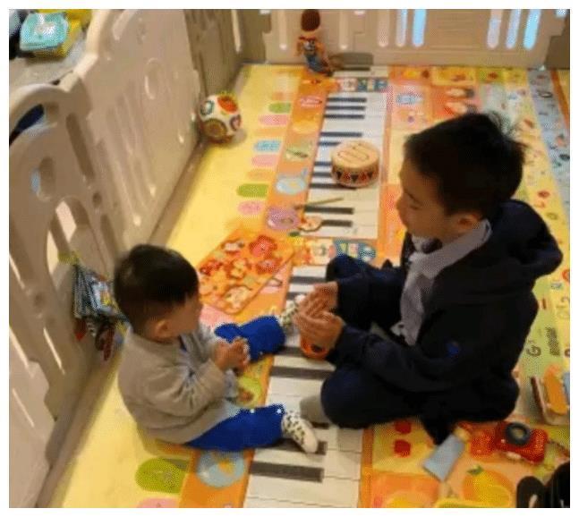 照片中,陈小春的次子很少露面。他聪明地坐在地板上,看起来又软又可爱。Jasper耐心地和1岁的弟弟玩耍,似乎在拍手教弟弟童谣。两个人被各种玩具包围着,画面很温馨。