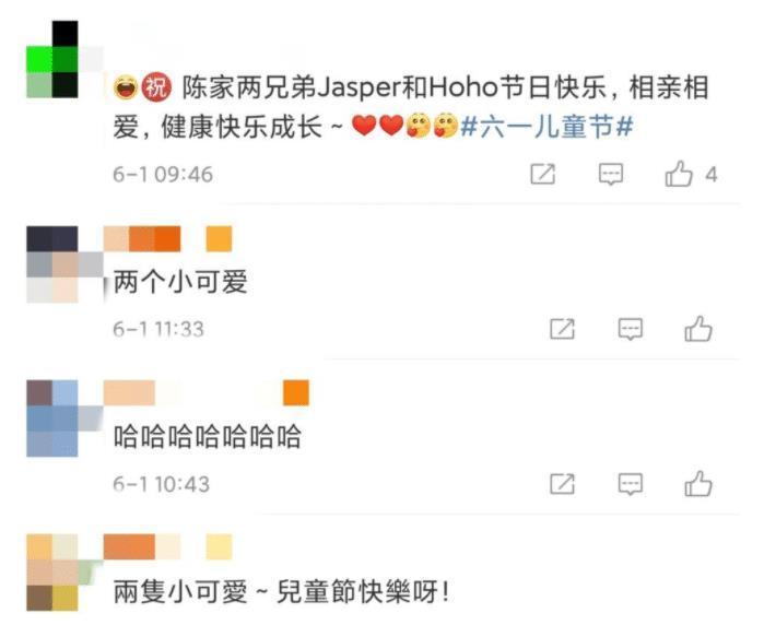 看了两兄弟相处的照片后,网友留言说是两个可爱的小家伙,祝他们儿童节快乐。也有网友留言祝福陈氏两兄弟健康成长,相亲相爱。