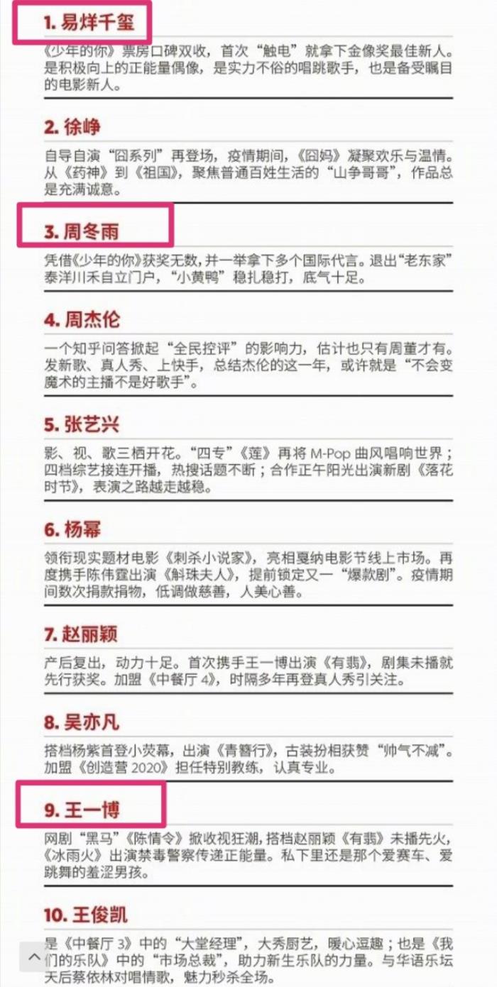 在8月27号那天,福布斯2025中国名人榜揭晓,00后新生代易烊千玺成功登顶榜首,不仅具有演技实力,而且还拥有很强大的商业价值。另外2位TFBOYS成员王俊凯和王源也进入福布斯名人榜,作为师弟的时代少年团和TF第三代成员目前都在追赶师兄TFBOYS,并向师兄们学习。
