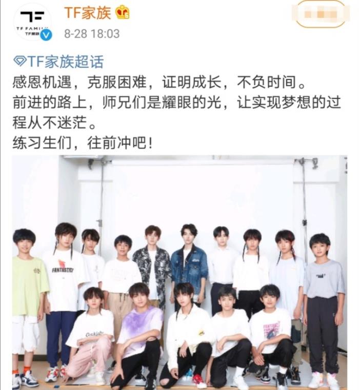 到了8月28号,TF家族晒出3代人的合照,各师兄师弟罕见同框,其中作为第一代成员王俊凯、王源和易烊千玺3人稳居C位,他们褪去了稚嫩,变得沉稳又充满朝气,除了在音乐方面发光发热,还在影视、综艺圈站稳脚跟,成为娱乐圈新生代。