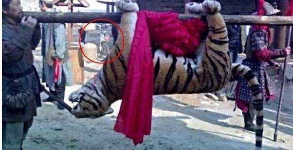 影视剧的拍摄中,由于剧组人员的疏忽和不走心,总是会出现各种道具问题。不过这里先别说这只假的不能再假的玩具老虎,就说众人后面的这辆自行车是怎么回事?这是哪位游客专门骑着自行车穿越到宋朝专程前来观摩武松打虎的英雄壮举?