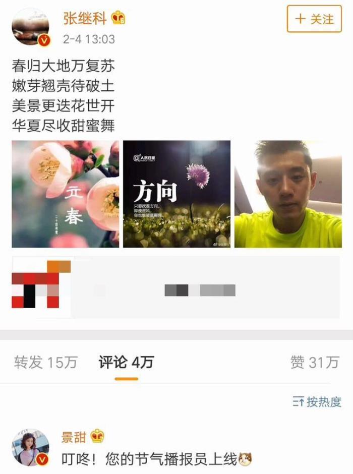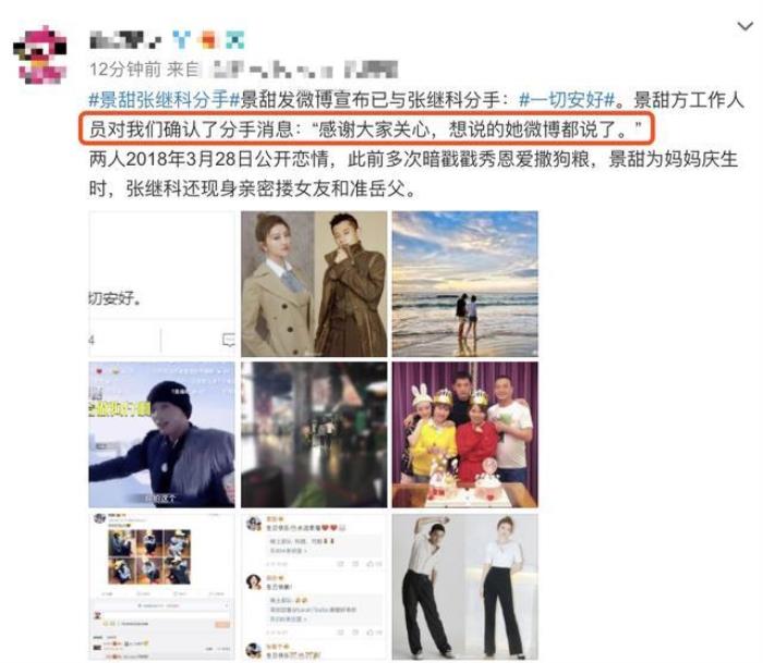 6月9日,景甜发微博官宣与张继科分手,”感恩曾经相遇,愿今后一切安好”。之后有媒体向景甜放工作人员求证,对方也确认了分手消息。