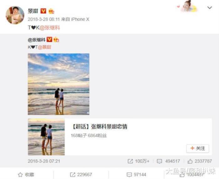 在他们官宣之前,两人经常在微博上互动撒狗粮,景甜发文说”想你”,张继科变身文艺男,发文写关于”景甜”藏头诗,有一次张继科在节目中,在镜头下写下了”K♡T”,真的是甜炸了呀!