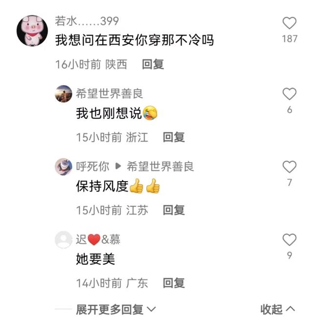 这样显身材的穿搭一直是吉娜的首选,不过她这是在西安,当天西安的温度最低只有8℃,这样的穿搭未免有点太冷了。网友也在评论区喊话“在西安你穿那不冷吗?”保持风度也要照顾好身体哦!