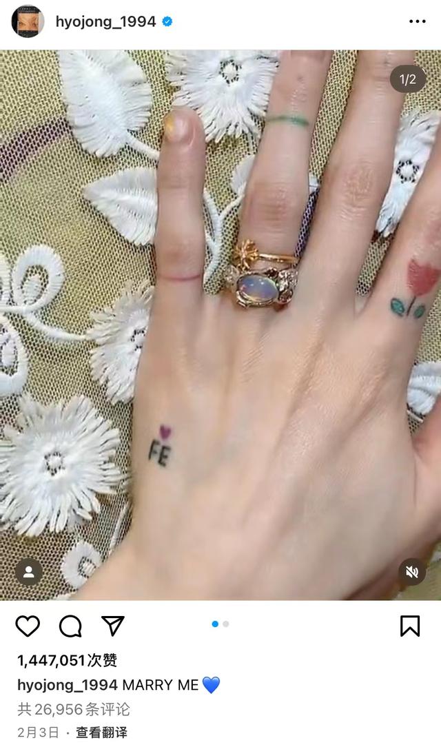 2月3日,金晓钟在社交平台晒出了一张纹身细节照,画面中金晓钟和泫雅戴着同款戒指,还纹上了情侣纹身,晒照时金晓钟发文求婚,直言“MARYY ME”,对此泫雅也回复“Yes”,两人高调官宣的操作让无数网友激动不已。