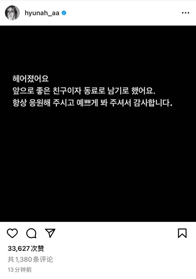 11月30日,韩国女星泫雅在社交平台发文官宣与金晓钟分手,结束了6年的情侣关系,消息曝光后引发热议。