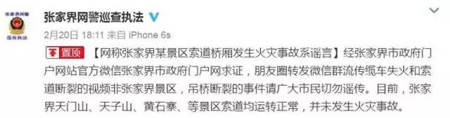 对于这则谣言,张家界市公安局网络安全保卫与技术侦察支队官方微博“@张家界网警巡查执法”进行了明确辟谣,称经张家界市政府门户网求证,朋友圈和微信群中流传的缆车失火和索道断裂的视频并非发生在张家界景区,并强调:“目前张家界天门山、天子山、黄石寨、等景区索道均运转正常。”