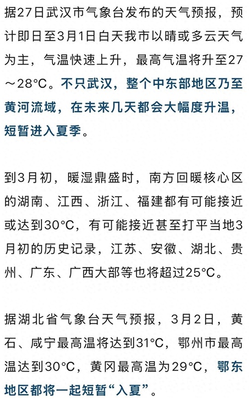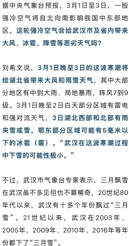 据武汉市气象台预报,3月1日夜间至3日受高空低槽、中低层切变线和地面强冷空气影响,武汉有寒潮大风和降水过程。3月2日,最高气温达到28℃,3月3日,最低气温降至0℃,直接由夏转冬。