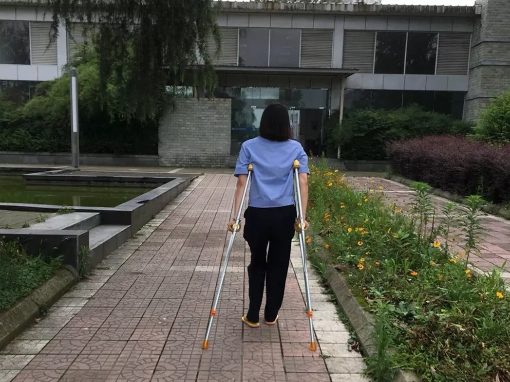 脚严重扭伤后,她没有卧床休息,打着绷带,拄着拐杖来上班……