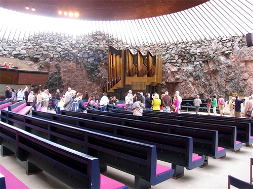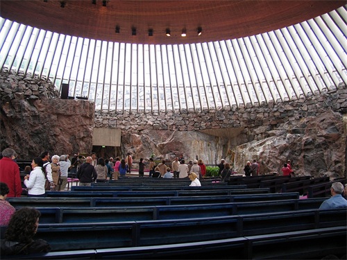 岩石教堂(Temppeliaukion Church)又名坦佩利奥基奥教堂,位于市中心的坦佩利岩石广场。岩石教堂卓越的设计极为新颖巧妙,完成于1969年。世界上唯一的建立在岩石中的教堂,飞碟般的外观彻底颠覆教堂的概念。教堂是利用位于住宅街的岩石高地建造而成,教堂就建造在天然岩石中。这里除了各种宗教仪式和举行婚礼外,还不定期举行包括交响乐在内的各种音乐会。
