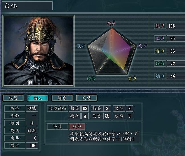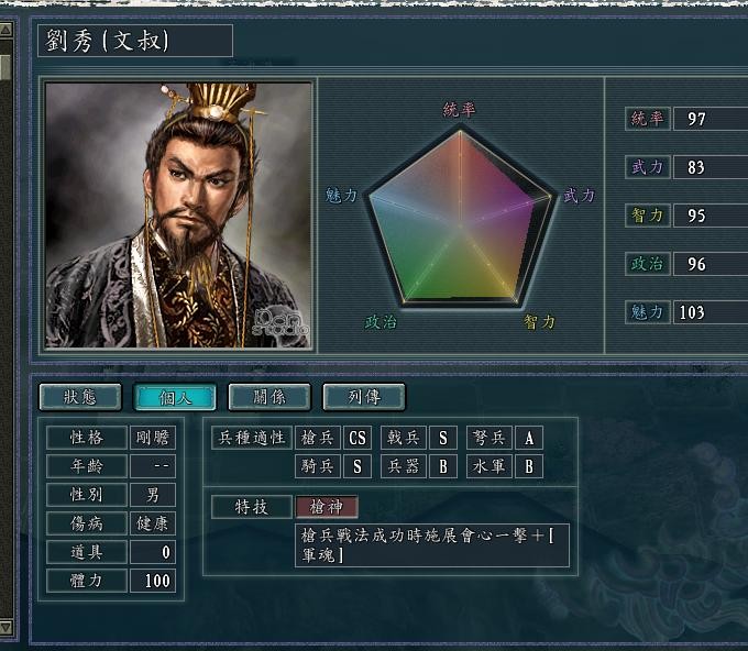 五维属性超高 97统御 作战历练后 升到100 开出三级基础光环 还有智力政治光环,特别是103的魅力的回复气力光环 (注意 刘秀的有军魂的 光环加成1.5的,提升整个军团的续航能力)配个奏乐,在刘秀身边基本 可以无限技能了。 就是枪神稍显不足 戟神的话 那就是完美中的完美。因为玩血色 双高,AI都是成批成批的来,枪神虽然硬控 高输出 无奈 面对潮水般的敌人一个个的控 似乎威力显得有点小