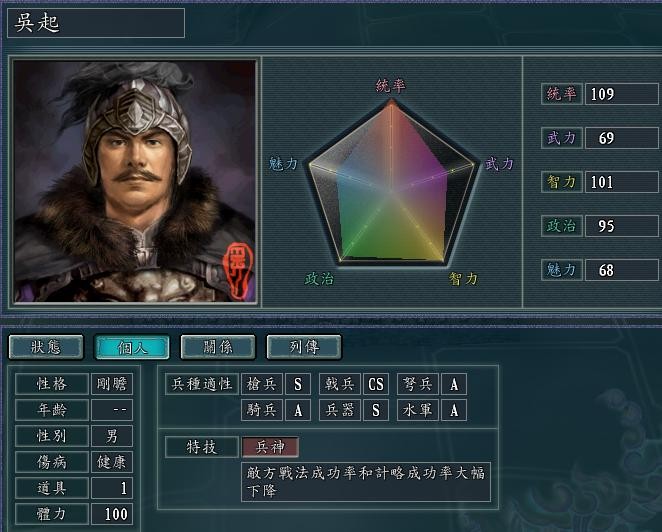 TOP 3 吴起 血色五大魔王之一 绝对的超级大坦克 兵种:戟兵,兵神这个技能太适合戟兵,技能成功率大幅下降后 基本都是普攻 这个高统御 之下 配上 金刚必选 护卫 或者不屈 二选一 自带101智力 不吃计谋 真正一个部队面对一整个军团都不虚的家伙! 集火再集火之下都难消灭