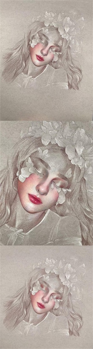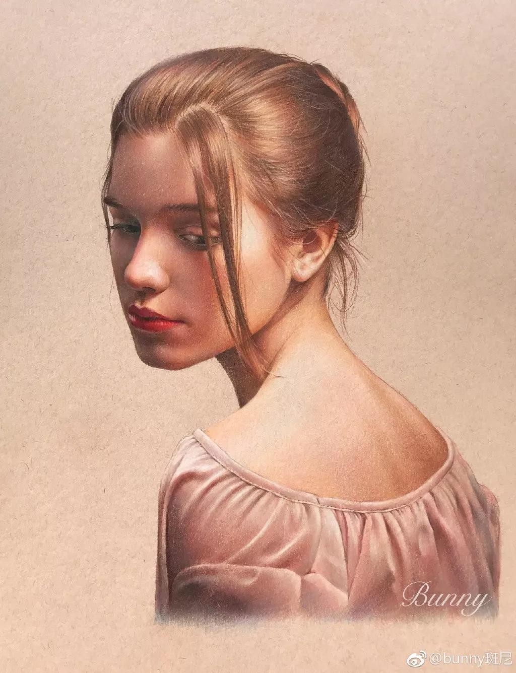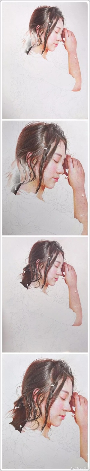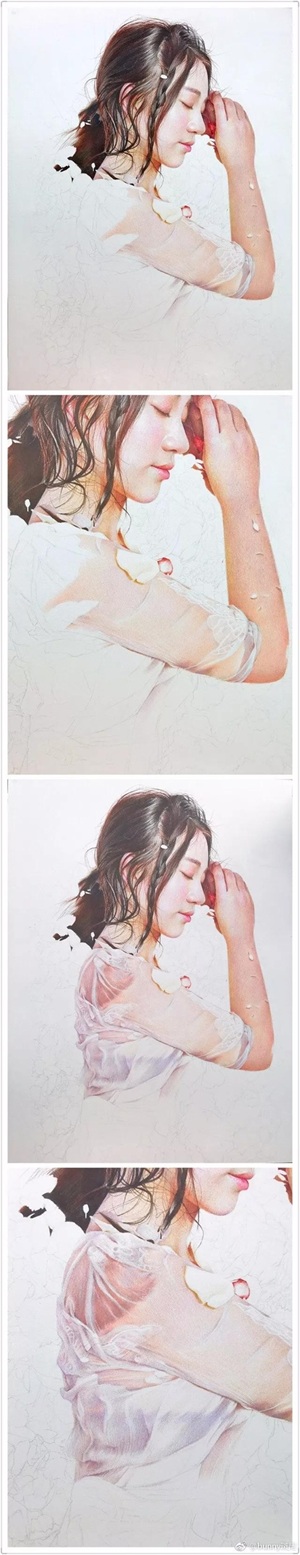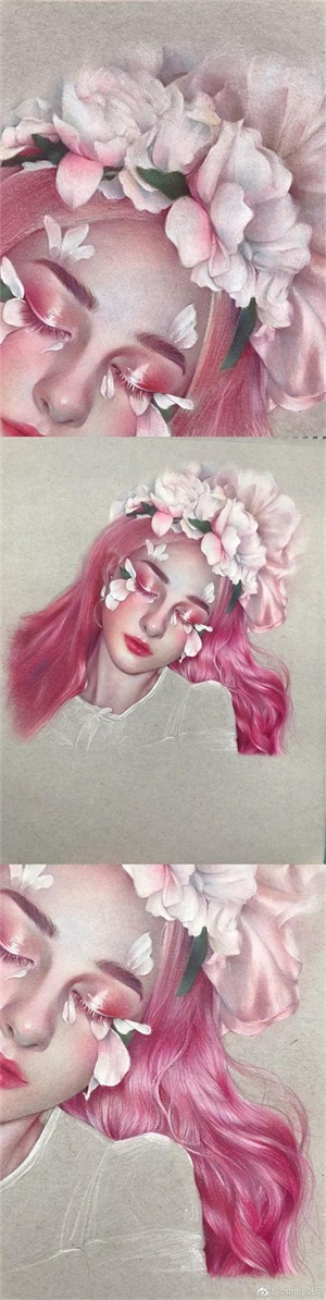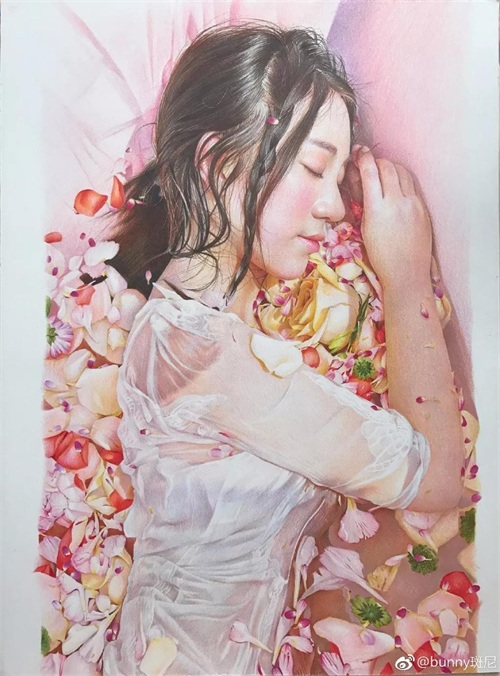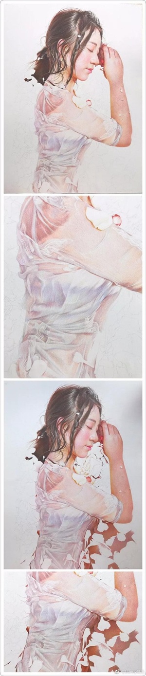 她的绘画功底很熟练,画风很成熟,她的彩铅作品很细腻
