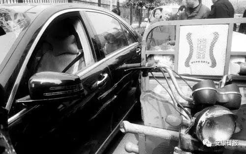 3月21日,安康市紫阳县企业家龚孝国开着价值近200万的奔驰S500轿车前往西安高新区科技路西口接人。车停在高新六路与科技路十字等人时,一辆卖苹果的三轮车与他的奔驰车发生了刮蹭。老太太没事,但奔驰车左侧车前已经变形,车身有一段很长的刮蹭痕迹,大片车漆被蹭掉。刚开始,老太太以为自己刮的是一辆普通车,准备赔钱,但听围观群众说这是辆豪车,几百几千块钱解决不了问题时,老太太一下子害怕起来,脸涨得通红,双手紧紧攥着胸前的皮包。