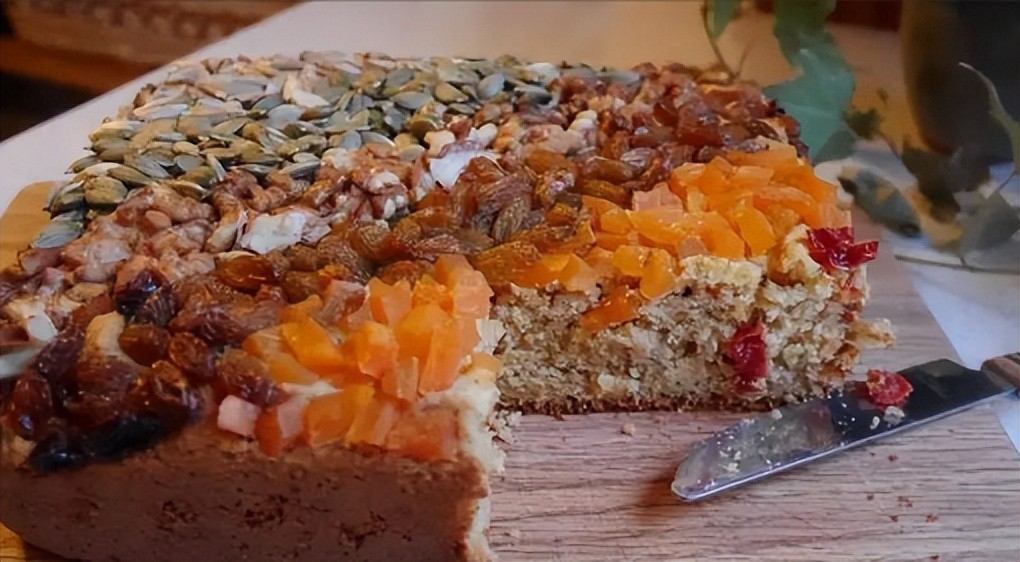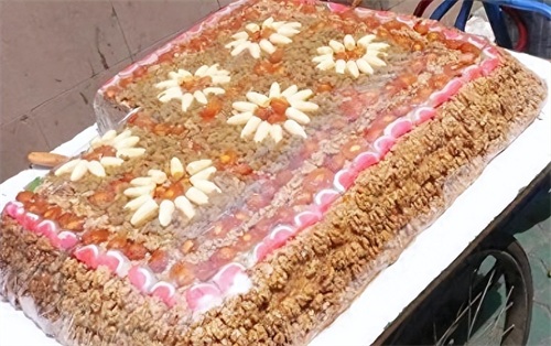 切糕的制作材料包括核桃、枣、葡萄干等,既可长期保存,又容易携带,同时含有人体所需的蛋白质、脂肪、维生素等多种营养成分。