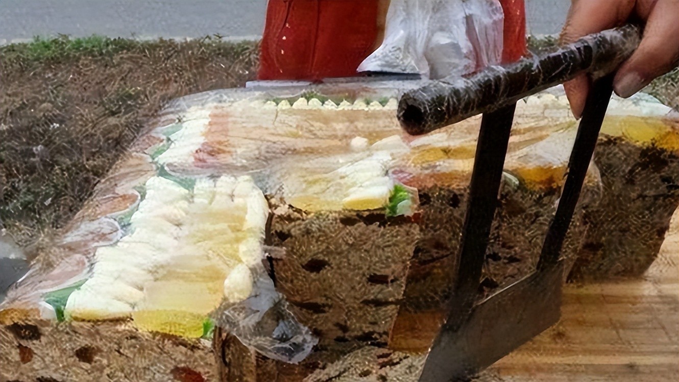 有消费者忍不住想买一个尝鲜,谁知道,摊贩一刀切下,竟要六十多块钱!顾客当即要求把糕切小一些,但摊贩强硬要求已经切下的必须买走,如果不买,站在周围的“同伙”就会围到一起,吓得顾客只能赶紧付钱离开。