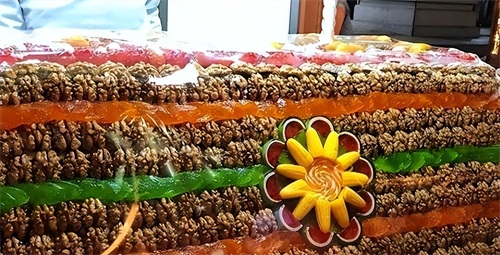 除此之外,关于切糕还有一种美丽的传说,相传一对贫困的老夫妻,在一位神仙指点下南行寻找“圣树”的果实,历尽艰险找到了和田的核桃。